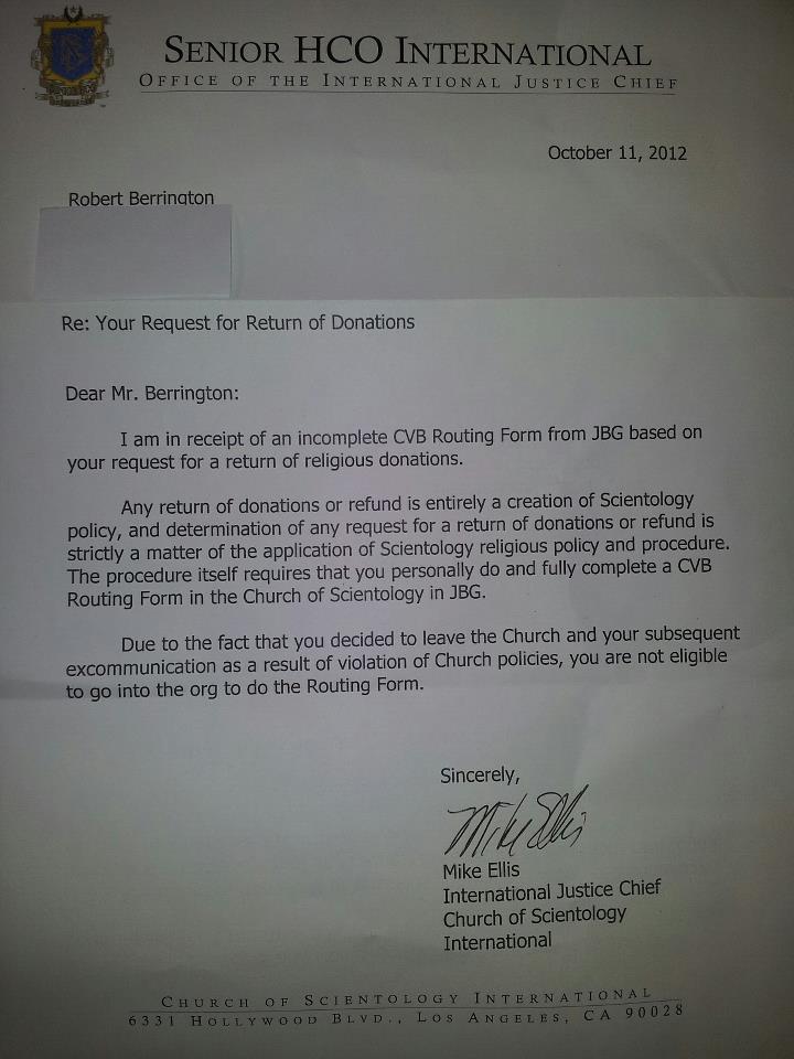 The latest trick off Scientology to prevent you from getting your money back is to say that you must come into the organization to get the repayment, but unfortunately you can’t come in to fill in their required paperwork as you’ve been “expelled” due to your own transgression against the “religious” policies of the “church.” Yes, Scientology is a criminal organization, and it is all about the money.